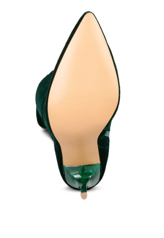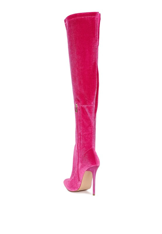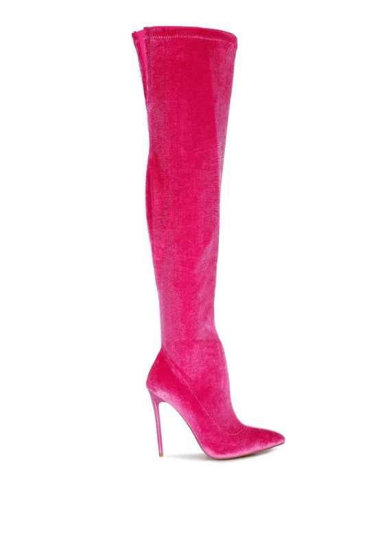 Sleek, shiny, chic! The beautiful stretch high heel boots are a vision to behold with the lovely velvet finish that...